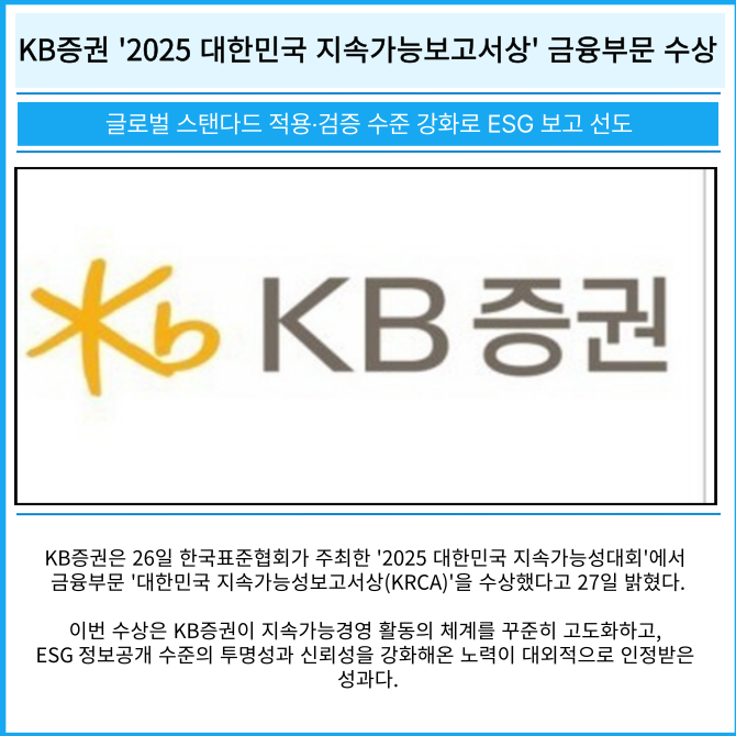 [프라임경제] KB증권은 26일 한국표준협회가 주최한 '2025 대한민국 지속가능성대회'에서 금융부문 '대한민국 지속가능성보고서상(KRCA)'을 수상했다고 27일 밝혔다.