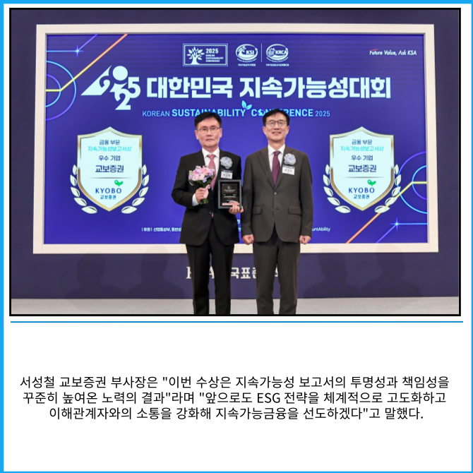 [프라임경제] 교보증권(030610)은 한국표준협회 주관 '2025 대한민국 지속가능성대회'에서 4년 연속 우수 보고서상을 수상했다고 27일 밝혔다.