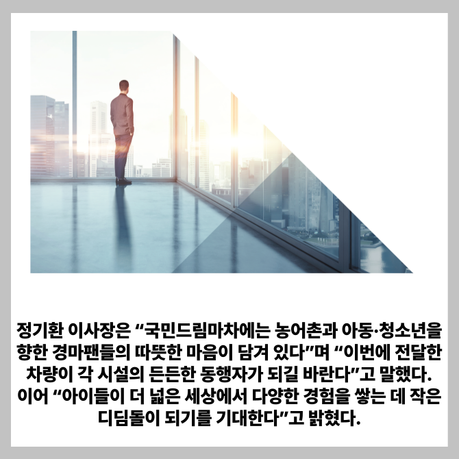 [프라임경제] 한국마사회 사회공헌재단(이사장 정기환)이 농어촌 아동·청소년의 발이 될 이동지원 차량을 추가로 지원했다고 27일 밝혔다.