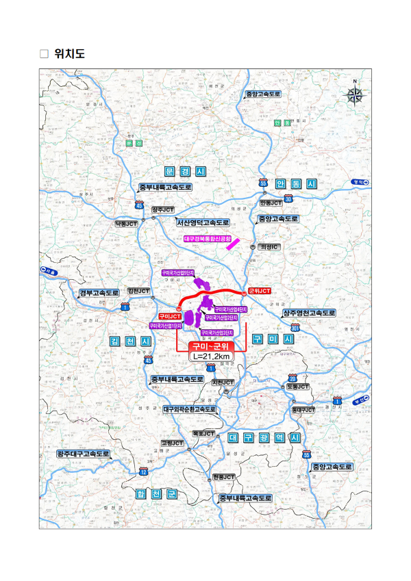 구미~군위 고속도로는 구미에서 군위군 효령면(중앙고속도로)까지 총 21.2km 구간을 4차로로 신설하는 사업으로, 사업비는 약 1조5627억 원 규모다. 이는 1970년 경부고속도로 이후 55년 만에 구미를 통과해 동서를 잇는 첫 고속도로라는 점에서 의미가 크다.