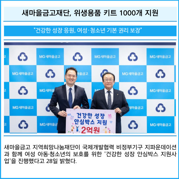 [프라임경제] 새마을금고 지역희망나눔재단이 국제개발협력 비정부기구 지파운데이션과 함께 여성 아동·청소년의 보호를 위한 '건강한 성장 안심박스 지원사업'을 진행했다고 28일 밝혔다.