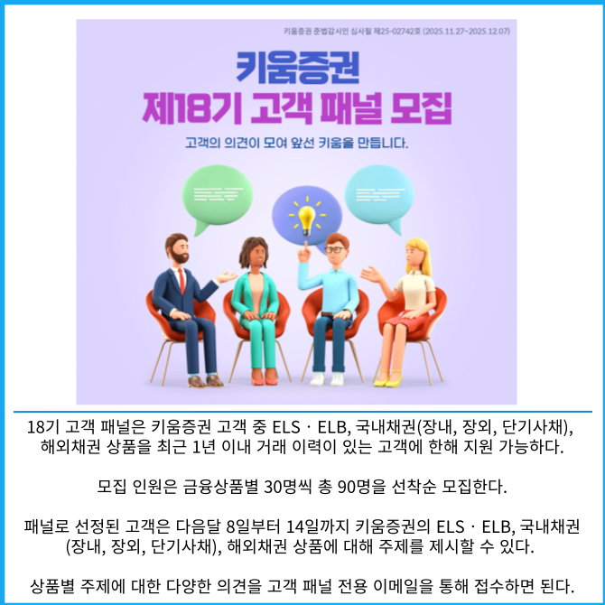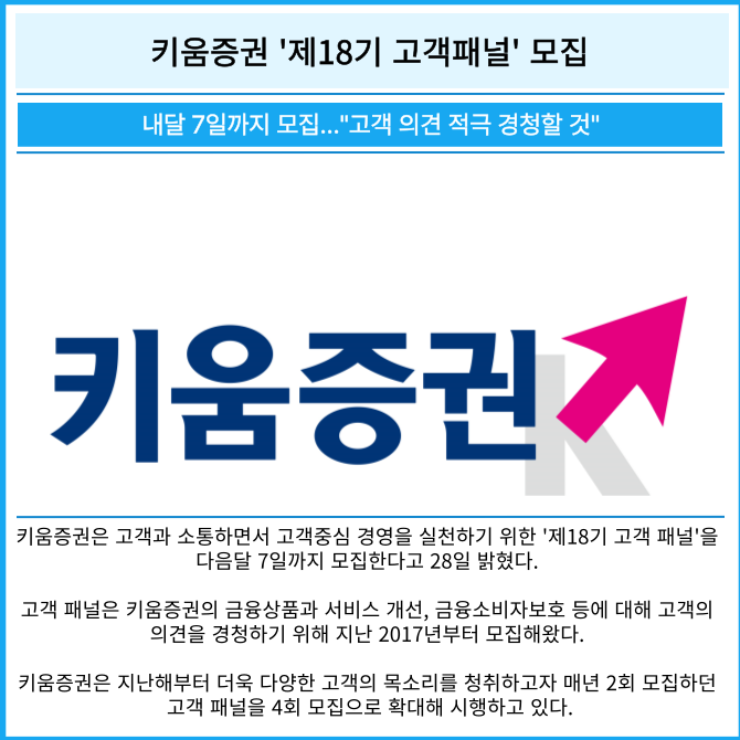 [프라임경제] 키움증권(039490)은 고객과 소통하면서 고객중심 경영을 실천하기 위한 '제18기 고객 패널'을 12월 7일까지 모집한다.