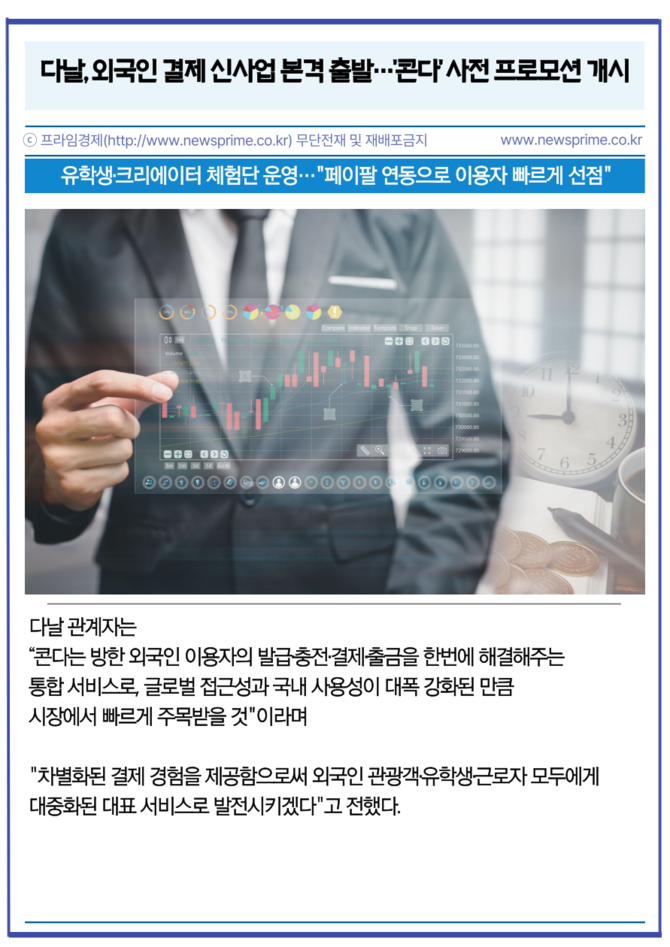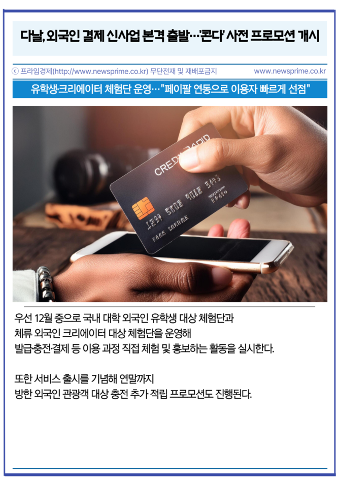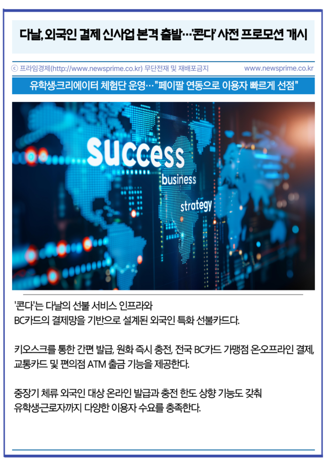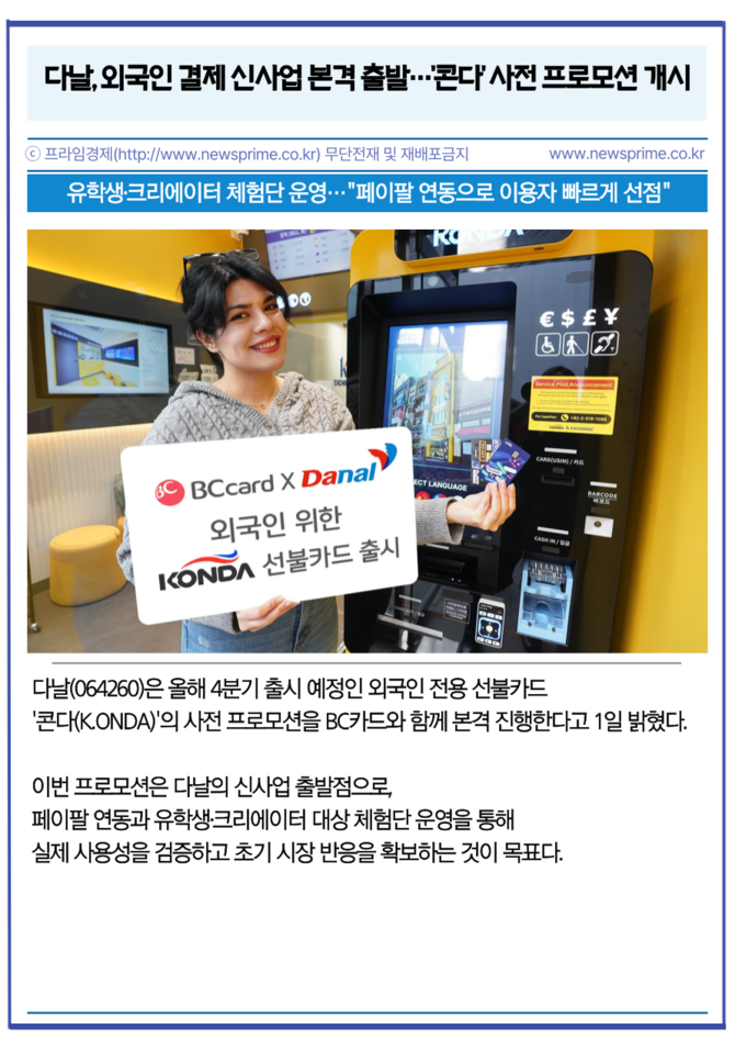 [프라임경제] 다날(064260)은 올해 4분기 출시 예정인 외국인 전용 선불카드 '콘다(K.ONDA)'의 사전 프로모션을 BC카드와 함께 본격 진행한다고 1일 밝혔다.