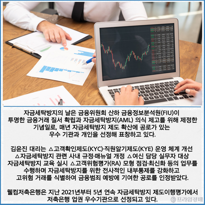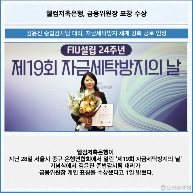 [프라임경제] 웰컴저축은행이 지난 28일 서울시 중구 은행연합회에서 열린 '제19회 자금세탁방지의 날' 기념식에서 김윤진 준법감시팀 대리가 금융위원장 개인 표창을 수상했다고 1일 밝혔다.