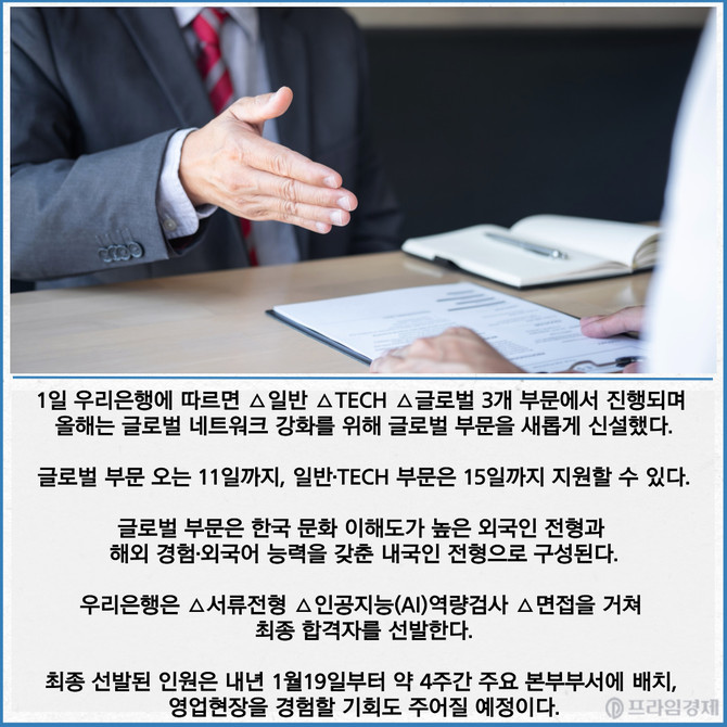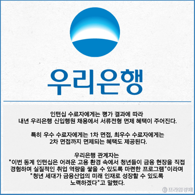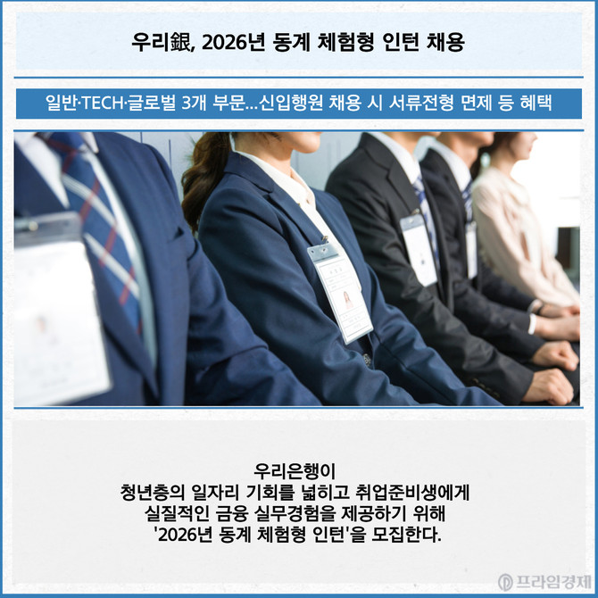 [프라임경제] 우리은행이 청년층의 일자리 기회를 넓히고 취업준비생에게 실질적인 금융 실무경험을 제공하기 위해 '2026년 동계 체험형 인턴'을 모집한다.
