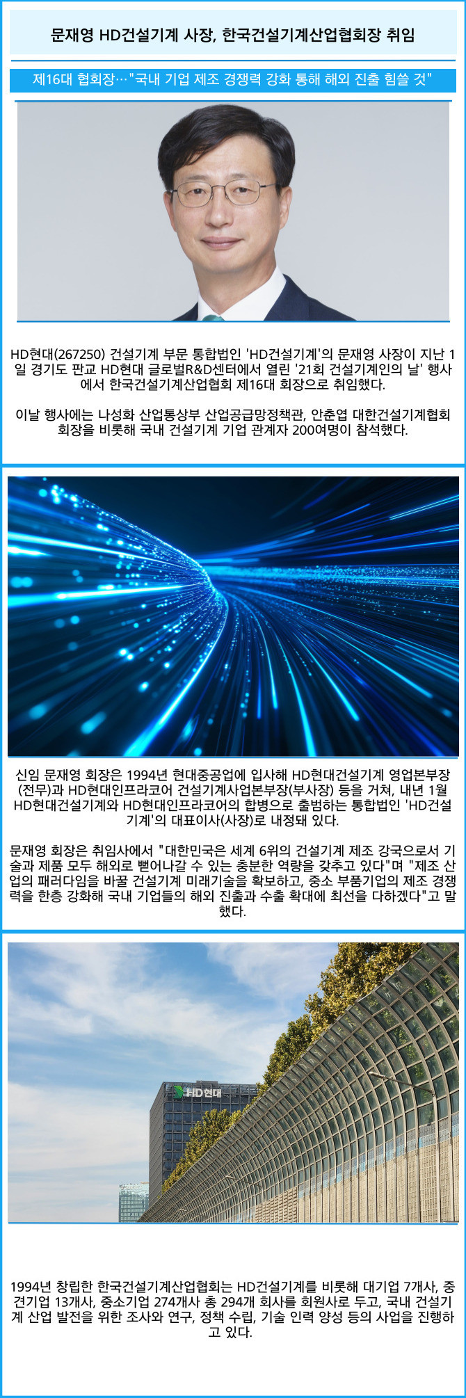 [프라임경제] HD현대(267250) 건설기계 부문 통합법인 'HD건설기계'의 문재영 사장이 지난 1일 경기도 판교 HD현대 글로벌R&D센터에서 열린 '21회 건설기계인의 날' 행사에서 한국건설기계산업협회 제16대 회장으로 취임했다.