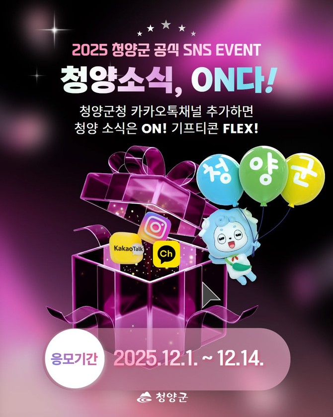 충남 청양군(군수 김돈곤)이 군정 소식을 보다 빠르고 편리하게 전달하기 위해 운영 중인 카카오채널을 활성화하고자 친구추가 이벤트 '청양소식, 온(ON)다!'를 오는 14일까지 진행한다.