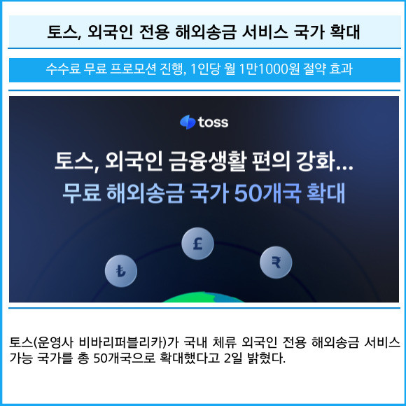 [프라임경제] 토스(운영사 비바리퍼블리카)가 국내 체류 외국인 전용 해외송금 서비스 가능 국가를 총 50개국으로 확대했다고 2일 밝혔다.