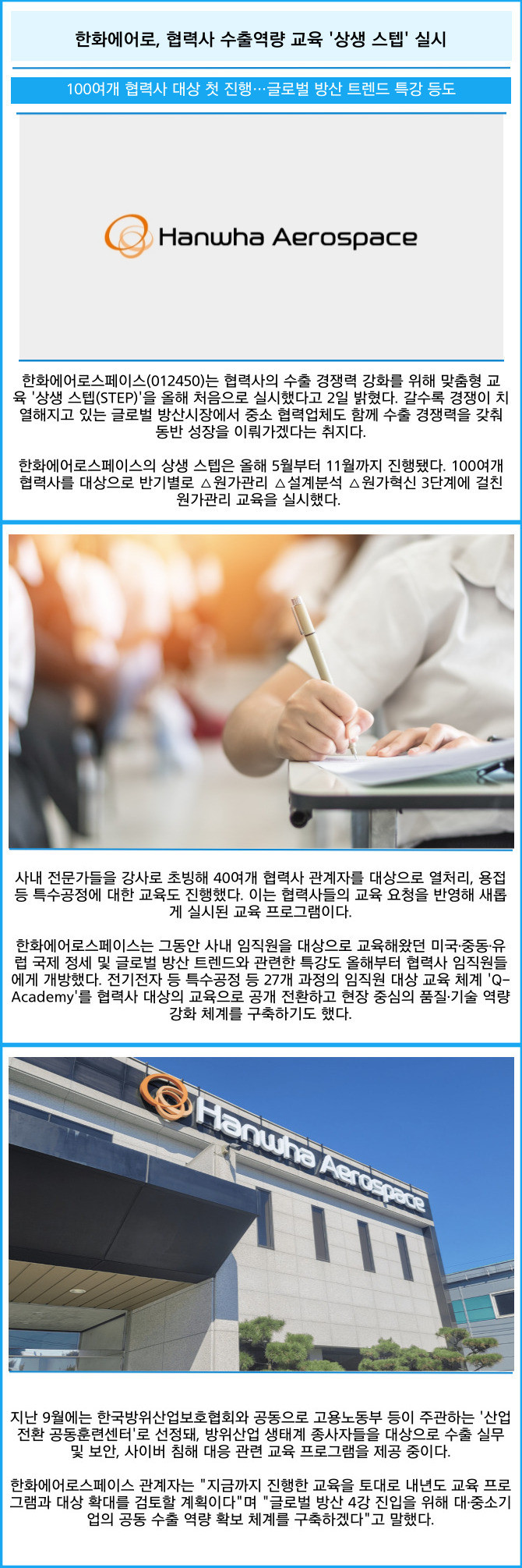 [프라임경제] 한화에어로스페이스(012450)는 협력사의 수출 경쟁력 강화를 위해 맞춤형 교육 '상생 스텝(STEP)'을 올해 처음으로 실시했다고 2일 밝혔다. 갈수록 경쟁이 치열해지고 있는 글로벌 방산시장에서 중소 협력업체도 함께 수출 경쟁력을 갖춰 동반 성장을 이뤄가겠다는 취지다.