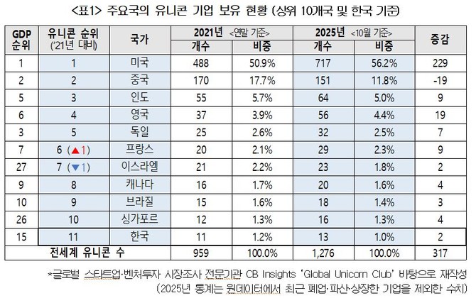특히 코로나19 이후 4년간 미국은 유니콘 기업이 229개 추가됐다. 반면 한국은 단 2개 증가에 그쳤다. 이는 중국이 19개 감소한 것을 제외하면 주요국 중 가장 저조한 수준이다.