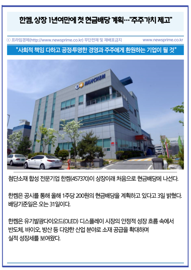 [프라임경제] 첨단소재 합성 전문기업 한켐(457370)이 상장이래 처음으로 현금배당에 나선다. 한켐은 공시를 통해 올해 1주당 200원의 현금배당을 계획하고 있다고 3일 밝혔다. 배당기준일은 오는 31일이다.