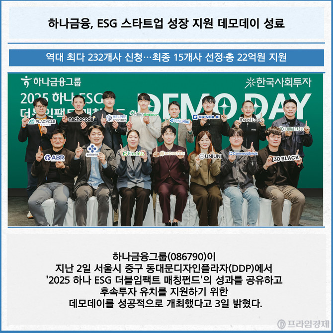 [프라임경제] 하나금융그룹(086790)이 지난 2일 서울시 중구 동대문디자인플라자(DDP)에서 '2025 하나 ESG 더블임팩트 매칭펀드'의 성과를 공유하고 후속투자 유치를 지원하기 위한 데모데이를 성공적으로 개최했다고 3일 밝혔다.