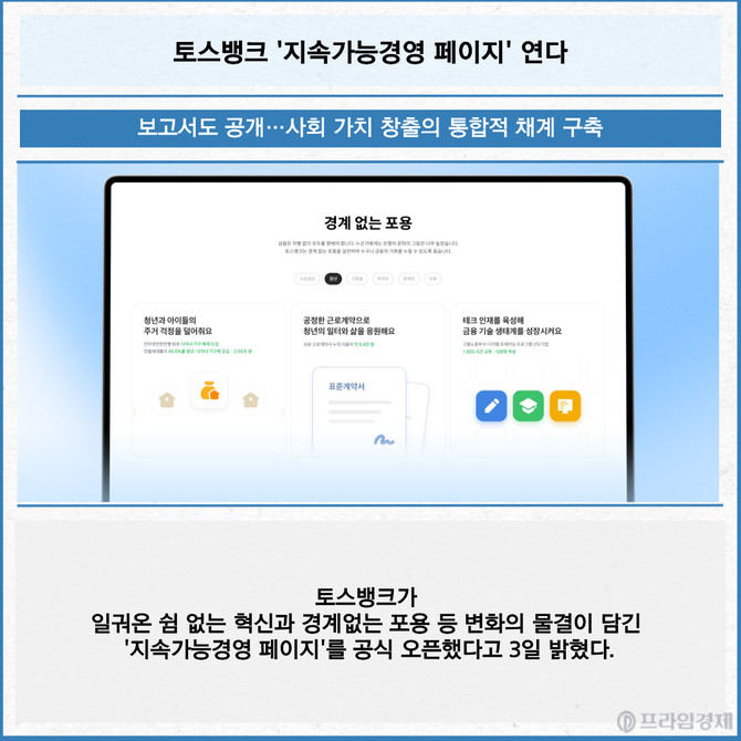 [프라임경제] 토스뱅크가 일궈온 쉼 없는 혁신과 경계없는 포용 등 변화의 물결이 담긴 '지속가능경영 페이지'를 공식 오픈했다고 3일 밝혔다.