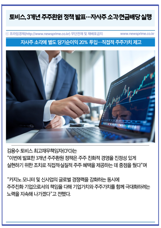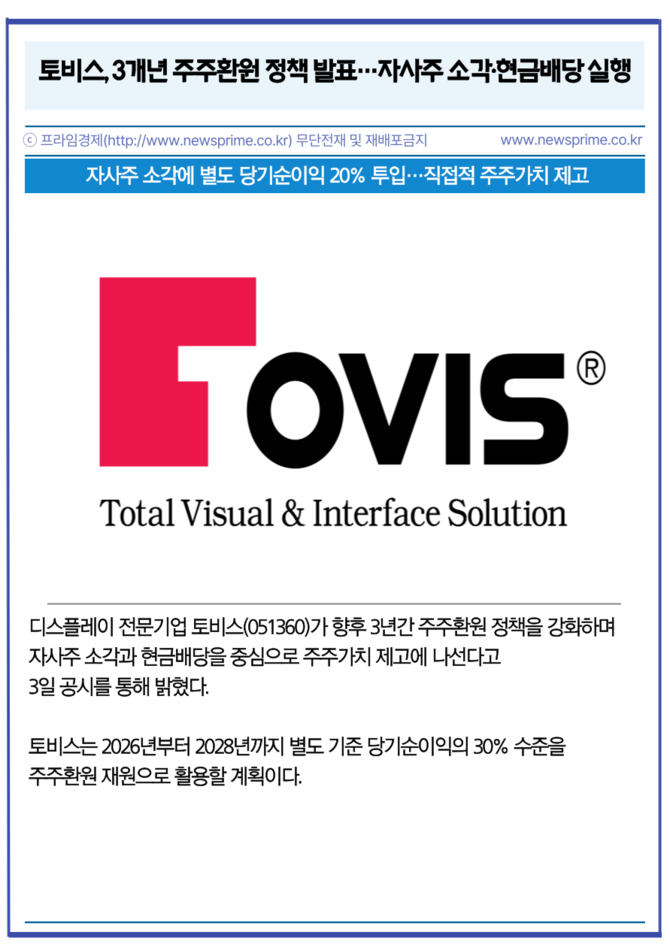 [프라임경제] 디스플레이 전문기업 토비스(051360)가 향후 3년간 주주환원 정책을 강화하며, 자사주 소각과 현금배당을 중심으로 주주가치 제고에 나선다고 3일 공시를 통해 밝혔다.
