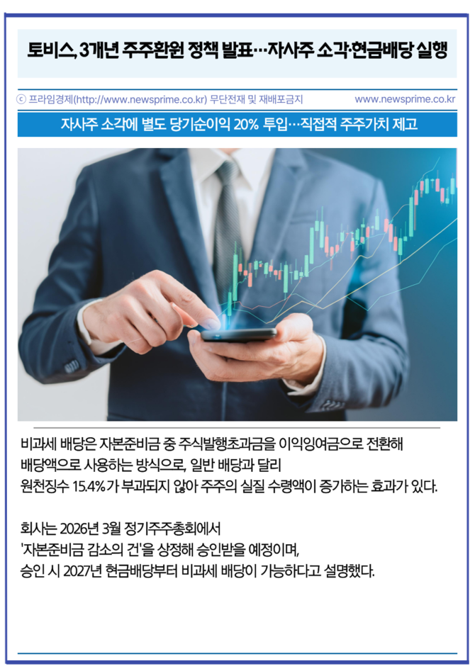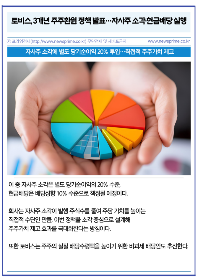 토비스는 2026년부터 2028년까지 별도 기준 당기순이익의 30% 수준을 주주환원 재원으로 활용할 계획이다. 이 중 자사주 소각은 별도 당기순이익의 20% 수준, 현금배당은 배당성향 10% 수준으로 책정될 예정이다.