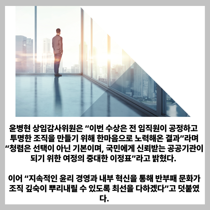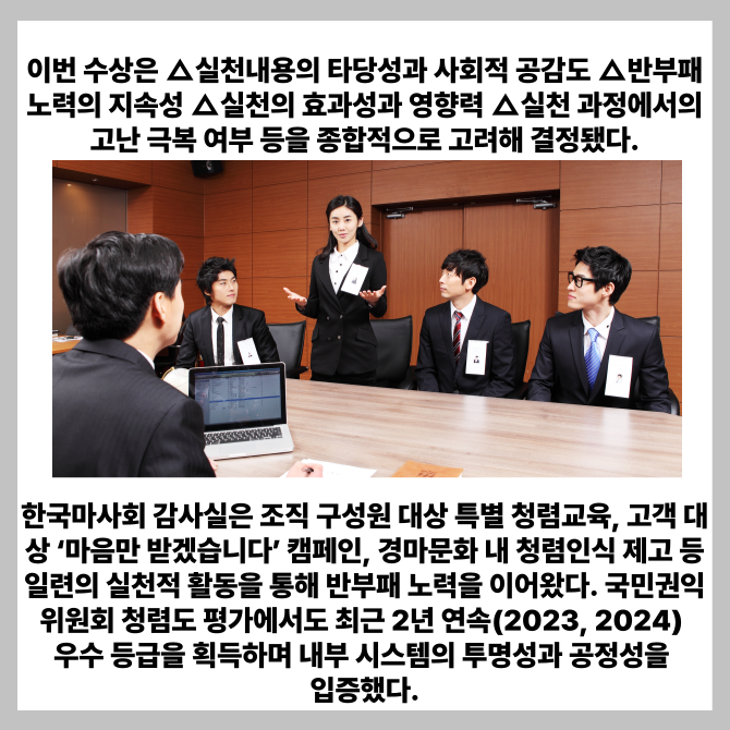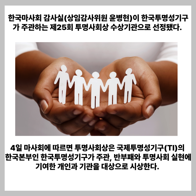 [프라임경제] 한국마사회 감사실(상임감사위원 윤병현)이 한국투명성기구가 주관하는 제25회 투명사회상 수상기관으로 선정됐다고 4일 밝혔다.