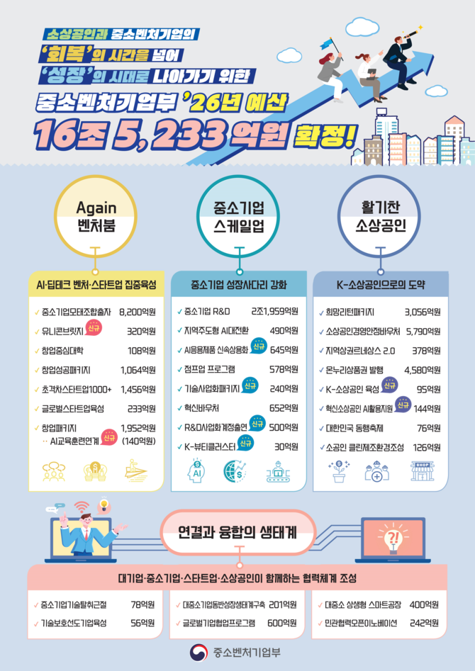 AI·바이오 등 초격차 신산업을 겨냥한 '초격차 스타트업 1000+' 예산은 2025년 1310억원에서 2026년 1456억원으로 확대됐다.