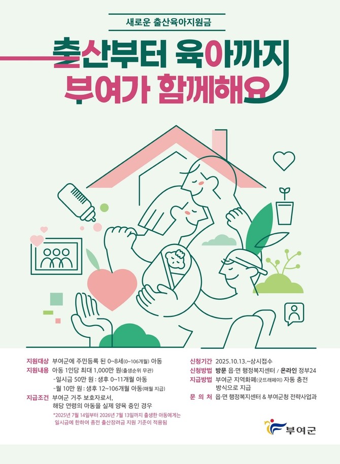부여군 관계자는 "출산육아지원금은 출산 초기뿐 아니라 아동의 성장 전반에 실질적인 도움이 되도록 설계된 제도"라며 "신청하지 못해 혜택을 받지 못하는 가정이 없도록 안내와 홍보를 더욱 강화해 나가겠다"고 밝혔다.