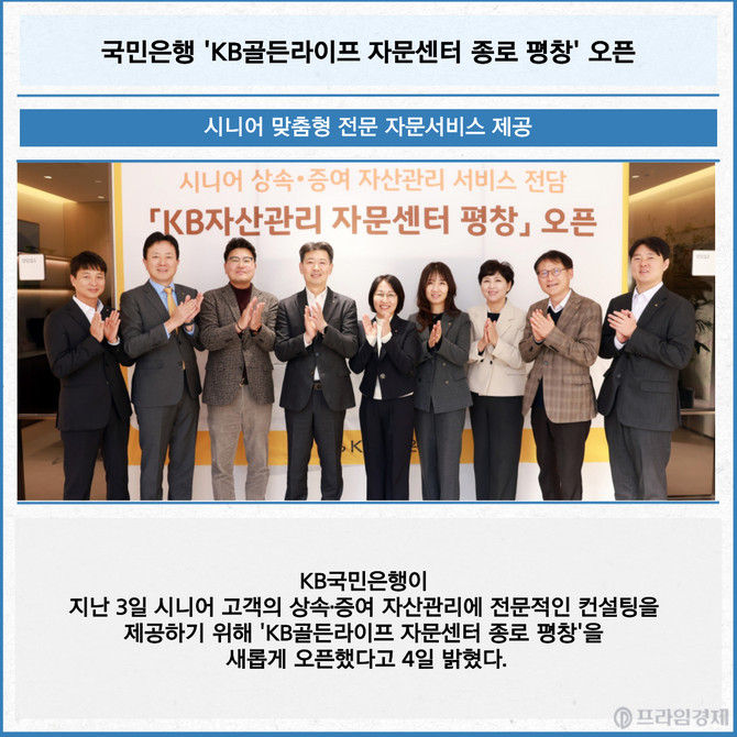 [프라임경제] KB국민은행이 지난 3일 시니어 고객의 상속·증여 자산관리에 전문적인 컨설팅을 제공하기 위해 'KB골든라이프 자문센터 종로 평창'을 새롭게 오픈했다고 4일 밝혔다.