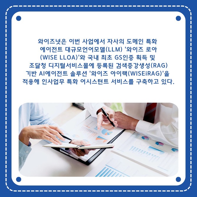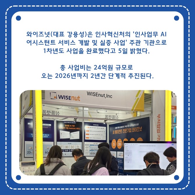 [프라임경제] 와이즈넛(096250, 대표 강용성)은 인사혁신처의 '인사업무 AI 어시스턴트 서비스 개발 및 실증 사업' 주관 기관으로 1차년도 사업을 완료했다고 5일 밝혔다.