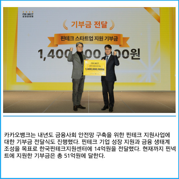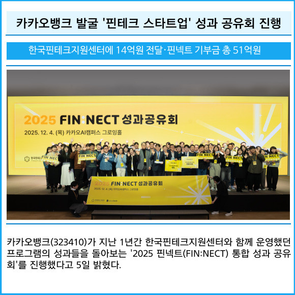 [프라임경제] 카카오뱅크(323410)가 지난 1년간 한국핀테크지원센터와 함께 운영했던 프로그램의 성과들을 돌아보는 '2025 핀넥트(FIN:NECT) 통합 성과 공유회'를 진행했다고 5일 밝혔다.