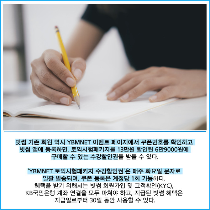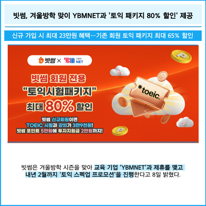[프라임경제] 빗썸은 겨울방학 시즌을 맞아 교육 기업 'YBMNET'과 제휴를 맺고 내년 2월까지 '토익 스펙업 프로모션'을 진행한다고 8일 밝혔다.