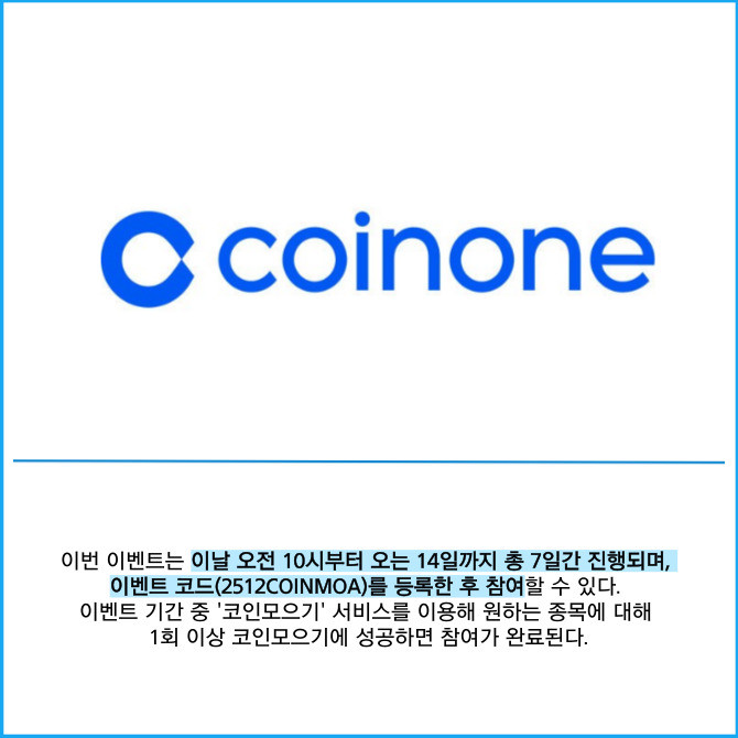 [프라임경제] 국내 대표 전문 가상자산 거래소 코인원은 자사의 자동 적립식 투자 서비스인 '코인모으기' 출시를 기념해 고객 이벤트를 진행한다고 8일 밝혔다.