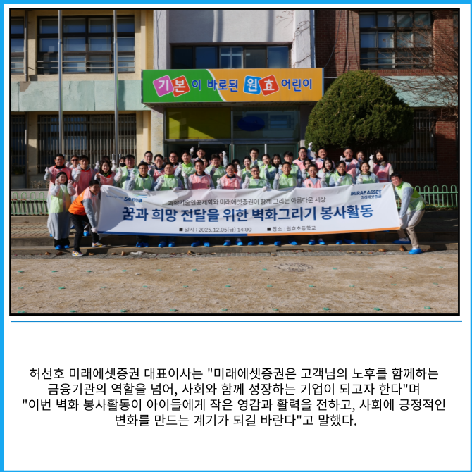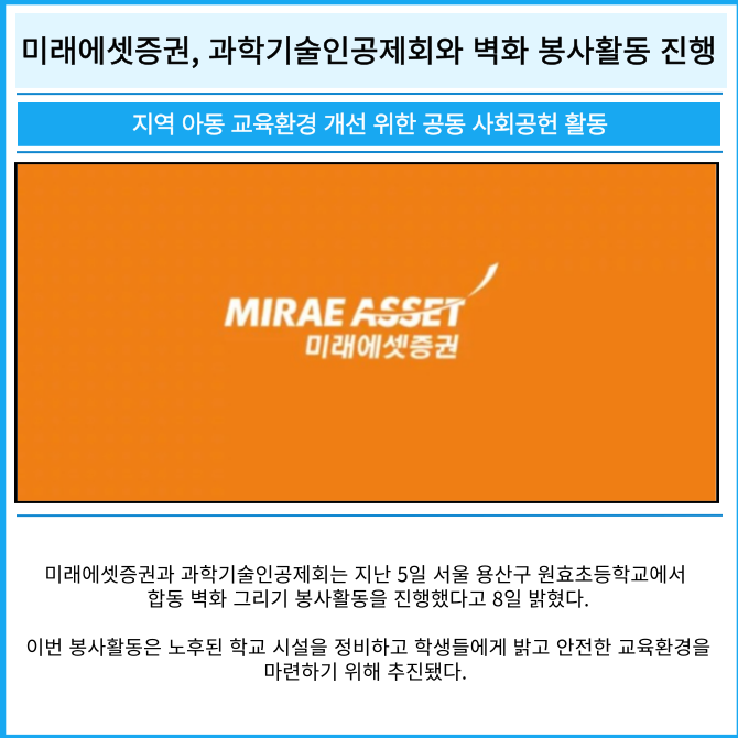 [프라임경제] 미래에셋증권(006800)과 과학기술인공제회는 지난 5일 서울 용산구 원효초등학교에서 합동 벽화 그리기 봉사활동을 진행했다고 8일 밝혔다.
