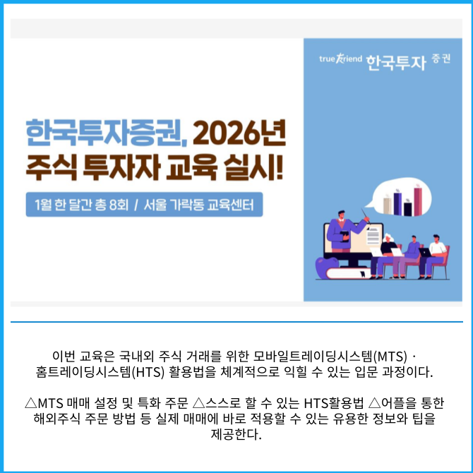 [프라임경제] 한국투자증권은 개인고객의 성공 투자와 건전한 투자 문화 조성을 위해 2026년 1월 한 달간 서울 가락동 교육센터에서 '주식 투자자 교육'을 실시한다고 8일 밝혔다.