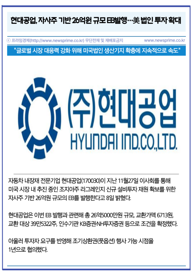 [카드] 현대공업, 자사주 기반 26억원 규모 EB발행…美 법인 투자 확대