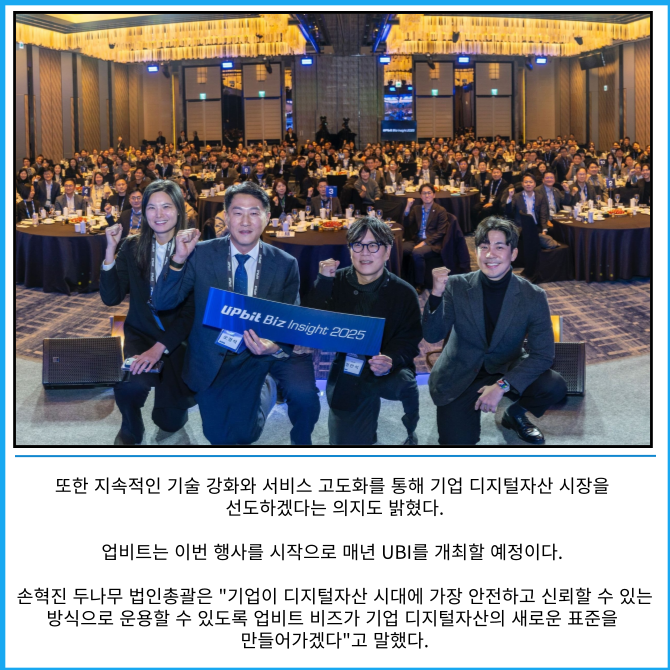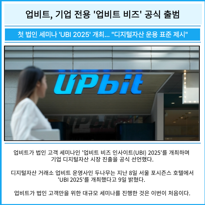 [프라임경제] 업비트가 법인 고객 세미나인 '업비트 비즈 인사이트(UBI) 2025'를 개최하며 기업 디지털자산 시장 진출을 공식 선언했다.