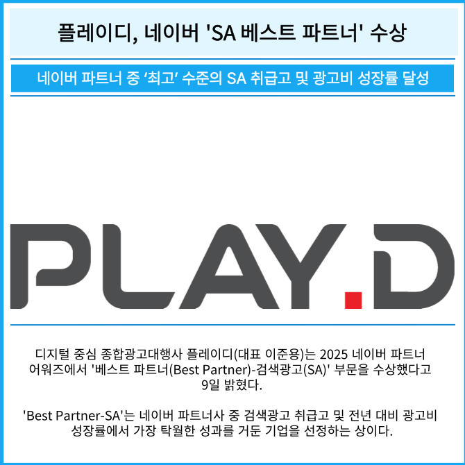 [프라임경제] 디지털 중심 종합광고대행사 플레이디(237820)는 2025 네이버 파트너 어워즈에서 '베스트 파트너(Best Partner)-검색광고(SA)' 부문을 수상했다고 9일 밝혔다.