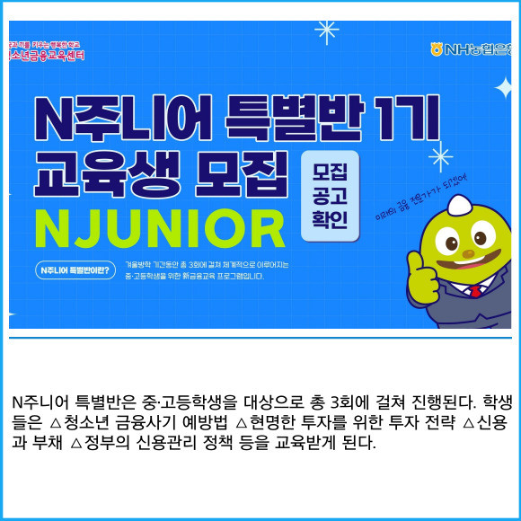 [프라임경제] NH농협은행이 겨울방학을 맞아 오는 15일과 16일부터 'N윈터 단과반·N주니어 특별반'의 수강생을 각각 모집한다고 9일 밝혔다.