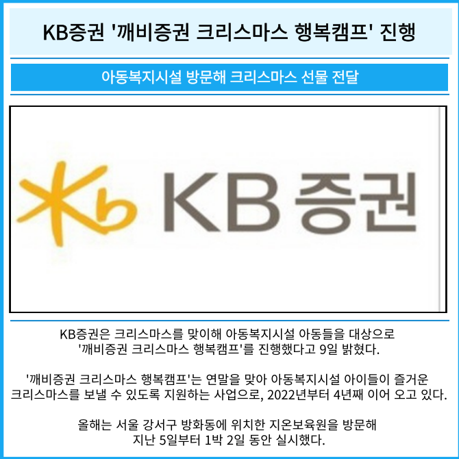 '깨비증권 크리스마스 행복캠프'는 연말을 맞아 아동복지시설 아이들이 즐거운 크리스마스를 보낼 수 있도록 지원하는 사업으로, 2022년부터 4년째 이어 오고 있다.
