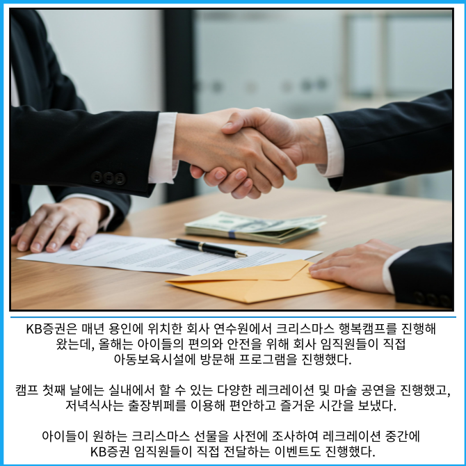 [프라임경제] KB증권은 크리스마스를 맞이해 아동복지시설 아동들을 대상으로 '깨비증권 크리스마스 행복캠프'를 진행했다고 9일 밝혔다.