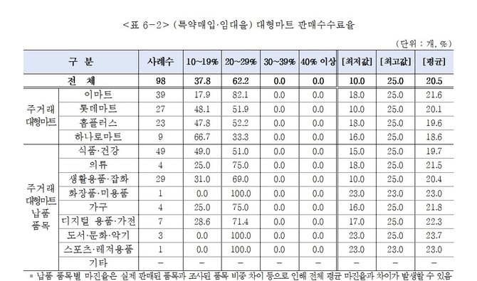 대형마트에서 가장 높은 판매수수료율은 이마트·롯데마트·하나로마트·홈플러스 모두 25.0%로 동일했다. 최저 수수료율은 백화점·마트 모두 롯데가 10.0%로 나타났다.