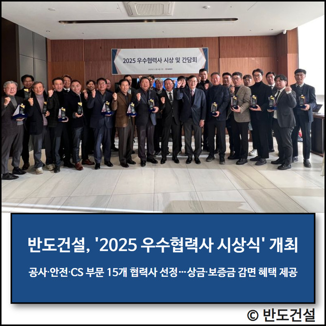 반도건설은 지난 4일 올 한 해 우수 실적 달성 협력사들과 '2025 우수협력사 시상식 및 협력사 간담회'를 개최했다고 9일 밝혔다. 간담회에는 김용철 반도건설 사장, 이정렬 시공부문 대표 및 임직원들과 우수협력사 선발 15개사 대표, 임직원 등이 참석했다.