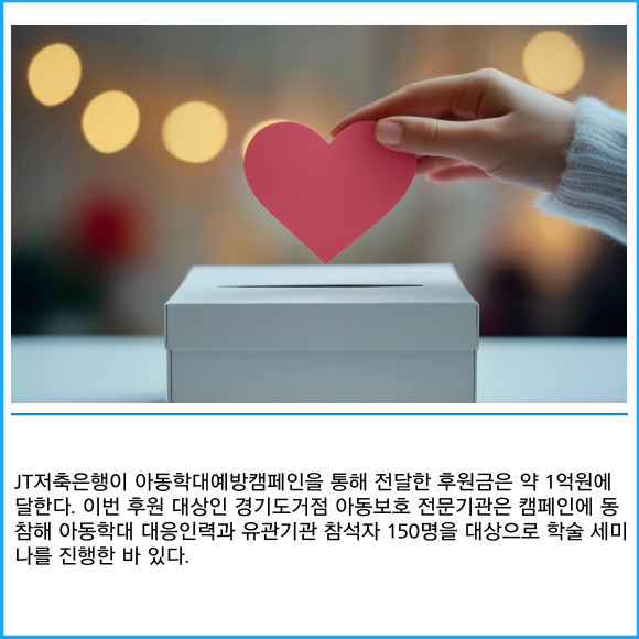 [프라임경제] JT저축은행이 지난 10월부터 진행한 '제5회 아동학대예방 캠페인'의 일환으로 경기도거점 아동보호 전문기관에 후원금 1500만원을 전달했다고 10일 밝혔다.