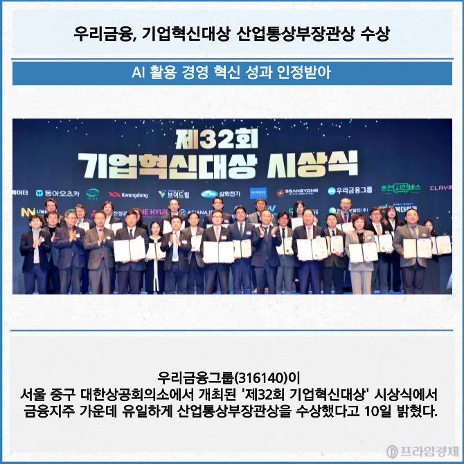 [프라임경제] 우리금융그룹(316140)이 서울 중구 대한상공회의소에서 개최된 '제32회 기업혁신대상' 시상식에서 금융지주 가운데 유일하게 산업통상부장관상을 수상했다고 10일 밝혔다.