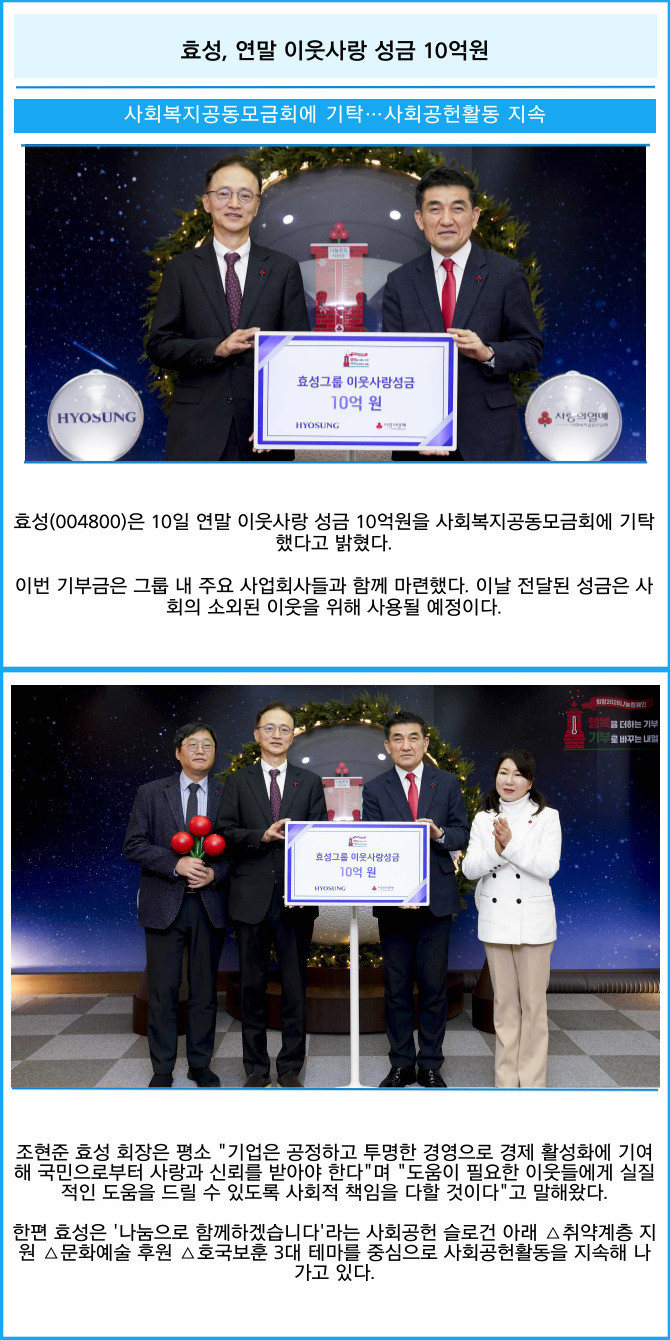 [프라임경제] 효성(004800)은 10일 연말 이웃사랑 성금 10억원을 사회복지공동모금회에 기탁했다고 밝혔다.