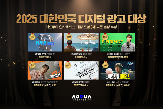 이외에도 떨어진 머리카락을 청소하는 탈모인에 대한 위로와 응원의 메시지를 전하며 커뮤니티 활성화에 기여한 대다모닷컴의 '헤어팟(HairPods)’ 캠페인이 프로모션 부문 우수상을 차지하는 등 애드쿠아는 총 6관왕에 오르게 됐다.