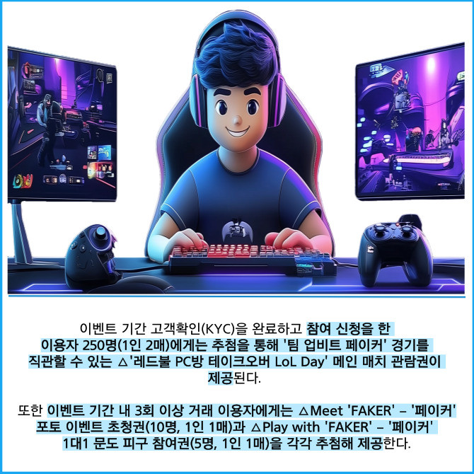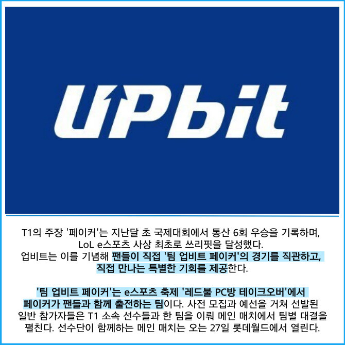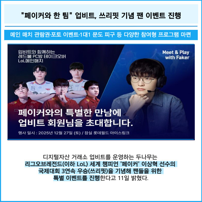 [프라임경제] 디지털자산 거래소 업비트를 운영하는 두나무는 리그오브레전드(이하 LoL) 세계 챔피언 '페이커' 이상혁 선수의 국제대회 3연속 우승(쓰리핏)을 기념해 팬들을 위한 특별 이벤트를 진행한다고 11일 밝혔다.