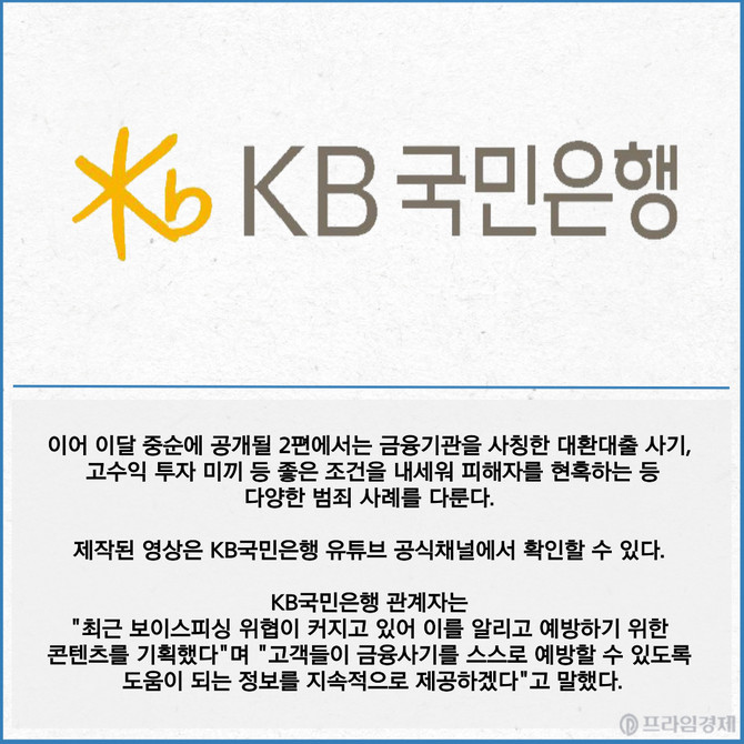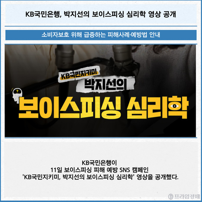 [프라임경제] KB국민은행이 11일 보이스피싱 피해 예방 SNS 캠페인 'KB국민지키미, 박지선의 보이스피싱 심리학' 영상을 공개했다.