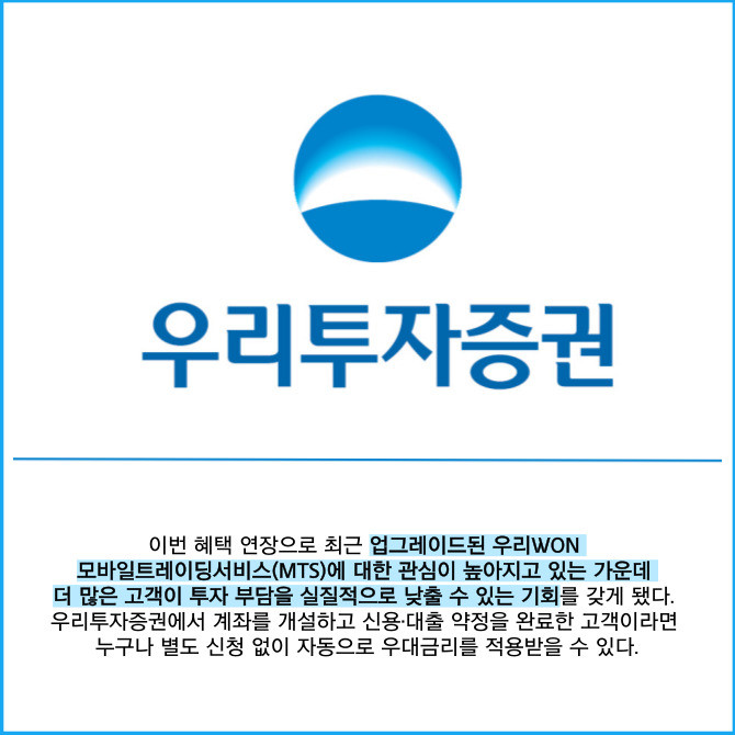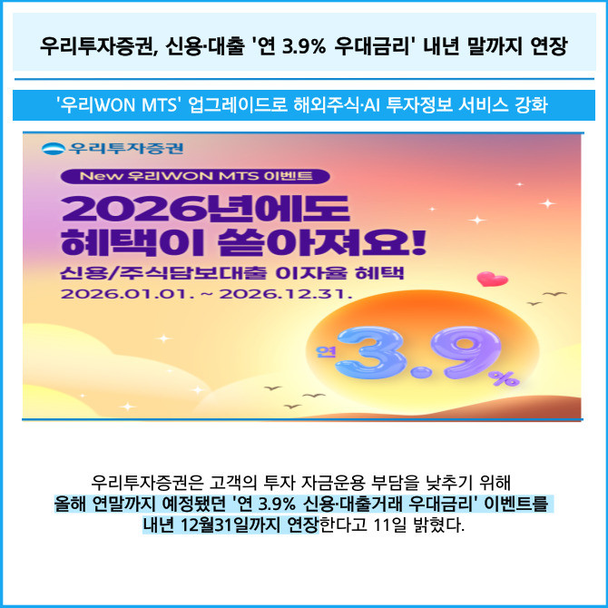 [프라임경제] 우리투자증권은 고객의 투자 자금운용 부담을 낮추기 위해 올해 연말까지 예정됐던 '연 3.9% 신용·대출거래 우대금리' 이벤트를 내년 12월31일까지 연장한다고 11일 밝혔다.