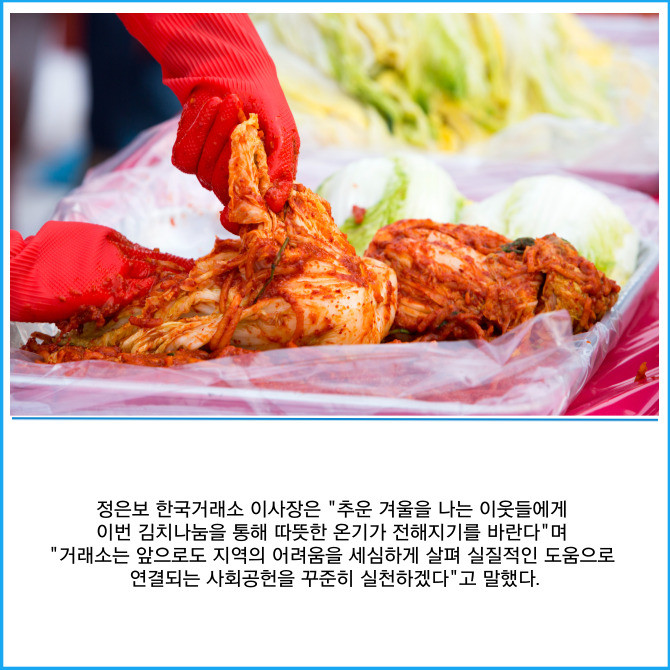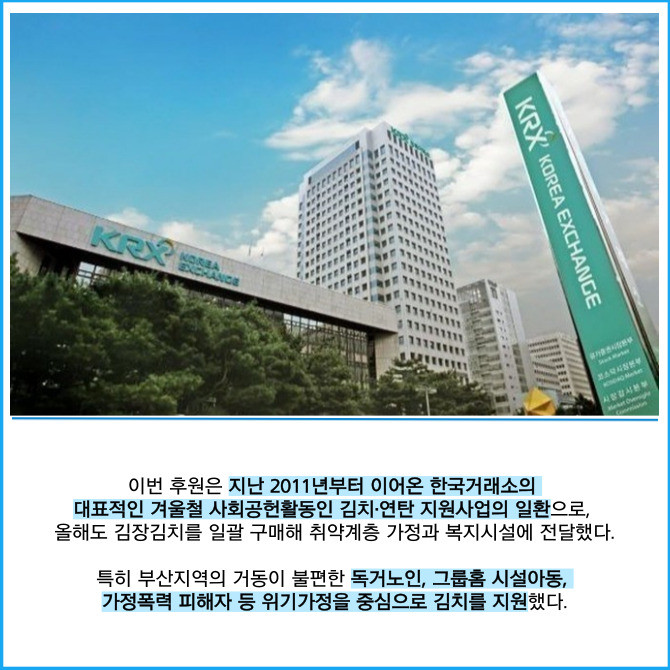 [프라임경제] 한국거래소는 연말 소외된 이웃들의 따뜻한 겨울나기를 지원하기 위해 부산지역 독거노인 등 취약계층에 김장 김치 26톤을 후원했다고 11일 밝혔다.