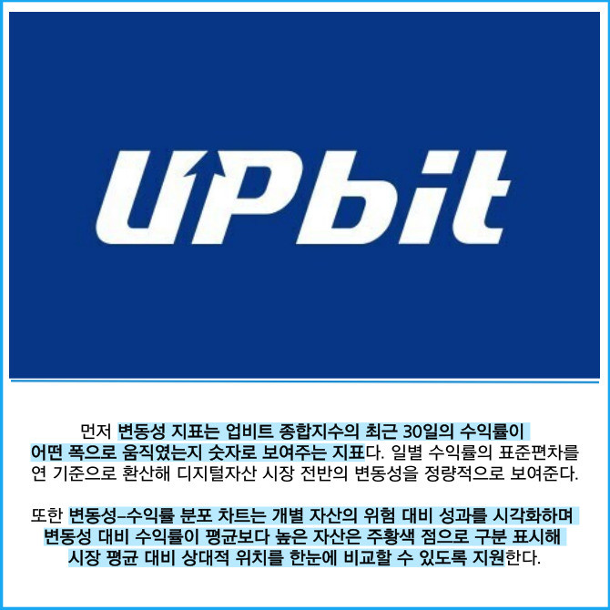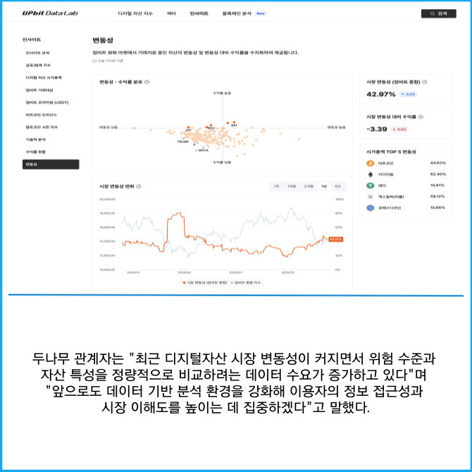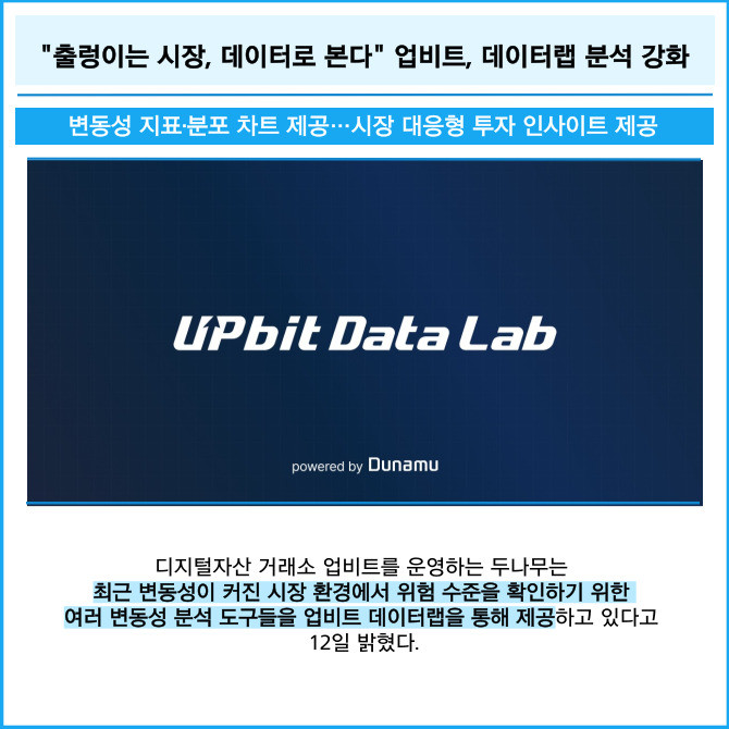 [프라임경제] 디지털자산 거래소 업비트를 운영하는 두나무는 최근 변동성이 커진 시장 환경에서 위험 수준을 확인하기 위한 여러 변동성 분석 도구들을 업비트 데이터랩을 통해 제공하고 있다고 12일 밝혔다.