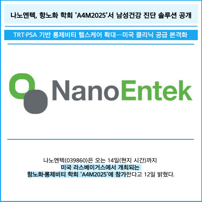[프라임경제] 나노엔텍(039860)은 오는 14일(현지 시간)까지 미국 라스베이거스에서 개최되는 항노화·롱제비티 학회 'A4M2025'에 참가한다고 12일 밝혔다.