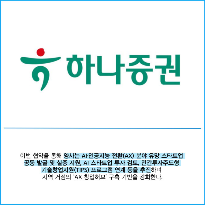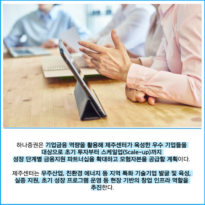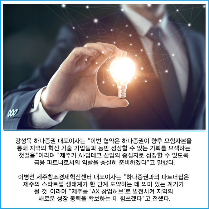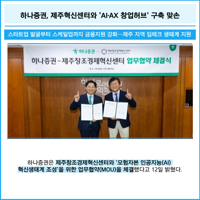 [프라임경제] 하나증권은 제주창조경제혁신센터와 '모험자본 인공지능(AI) 혁신생태계 조성'을 위한 업무협약(MOU)을 체결했다고 12일 밝혔다.