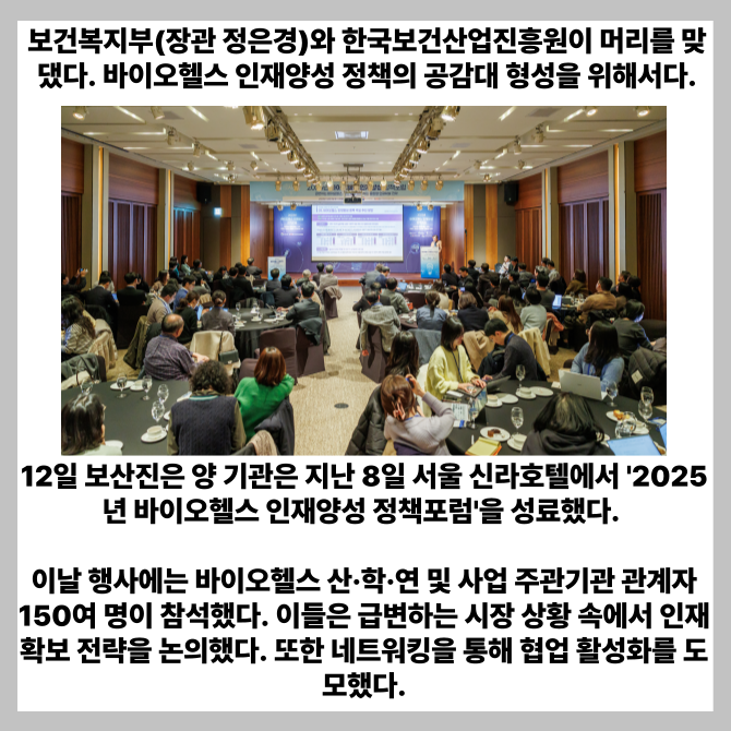 12일 보산진은 양 기관은 지난 8일 서울 신라호텔에서 '2025년 바이오헬스 인재양성 정책포럼'을 성료했다.