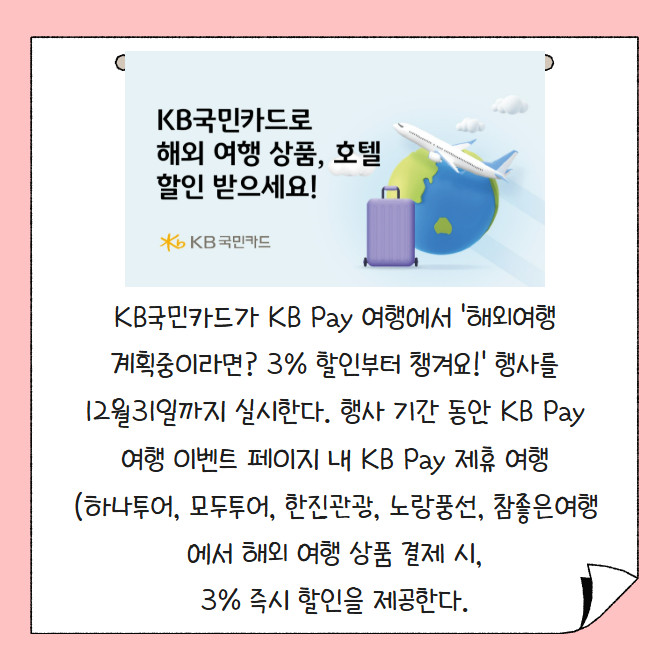 [프라임경제] KB국민카드가 KB Pay 여행에서 '해외여행 계획중이라면? 3% 할인부터 챙겨요!' 행사를 12월31일까지 실시한다. 행사 기간 동안 KB Pay 여행 이벤트 페이지 내 KB Pay 제휴 여행사(하나투어, 모두투어, 한진관광, 노랑풍선, 참좋은여행)에서 해외 여행 상품 결제 시, 3% 즉시 할인을 제공한다.